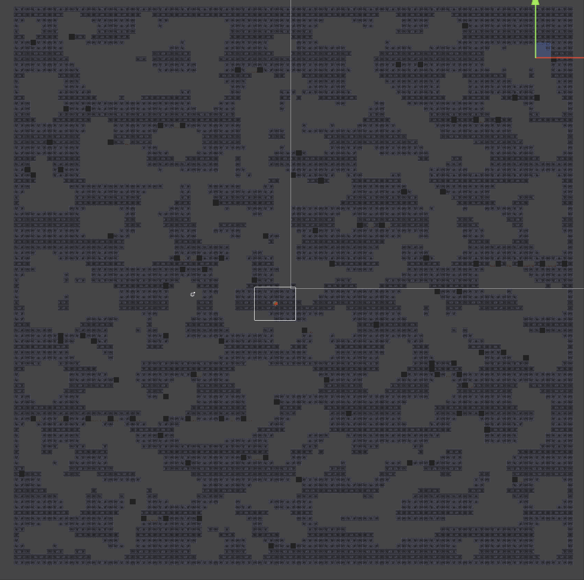 After that initial generation is done, two “clean up” passes are made. The first one goes through and fills in any empty tile that has at least 5 neighbouring/adjacent tiles. This “fills in” the level, and removes some weird-looking parts where there’d be just a single bit of empty space surrounded by lots of tiles. The second pass goes through and removes any tiles with less than 3 neighbours. This part is to increase the open space, and remove any single tiles that are jutting up or out of an otherwise straight surface.